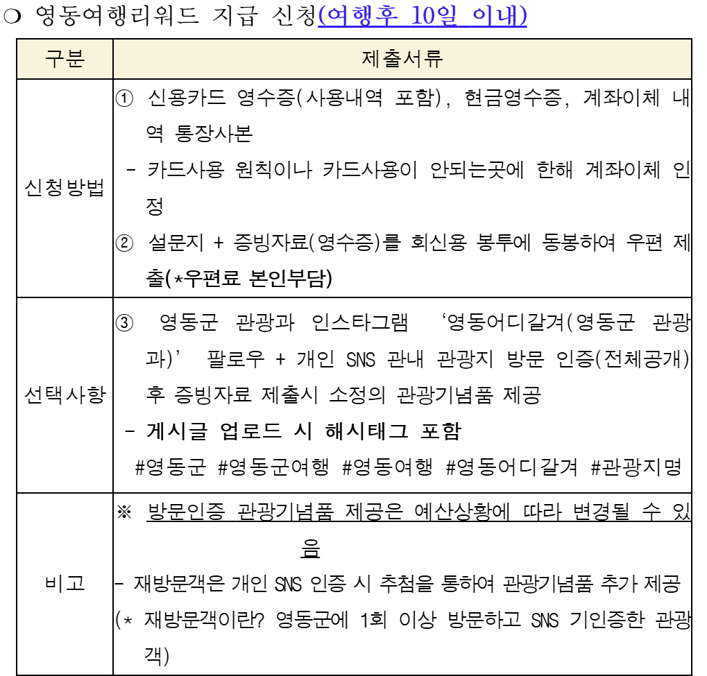 - 필수 조건: 영동군 관내 1박 이상 숙박 + 유료 관광지 1개소 이상 방문