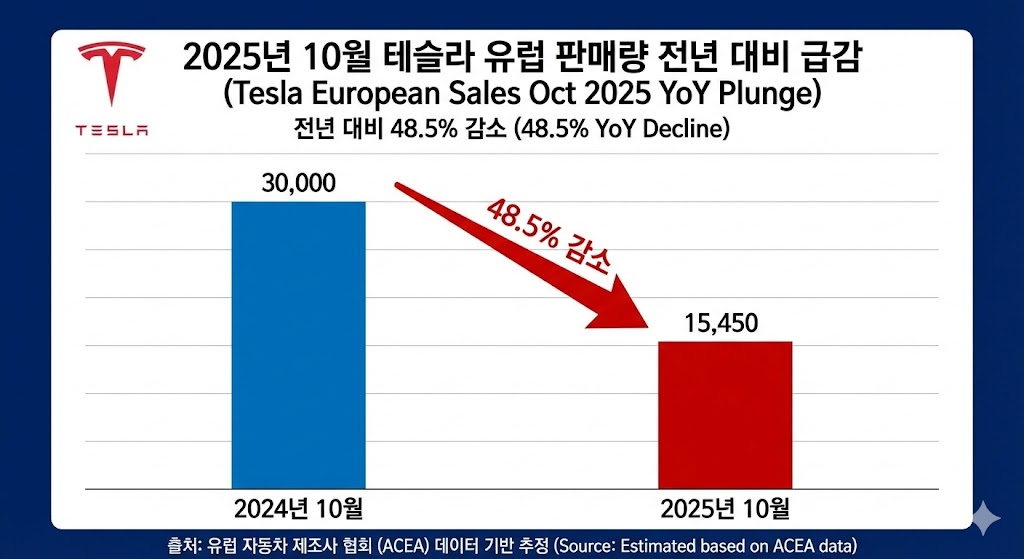 - 유럽 시장의 굴욕: 10월 테슬라 판매량은 전년 동기 대비 48.5% 폭락했습니다. 같은 기간 유럽 전체 전기차(EV) 시장이 26% 성장한 것과 정반대 행보입니다. 시장 파이는 커지는데 테슬라의 점유율만 급속도로 증발하고 있다는 뜻입니다.