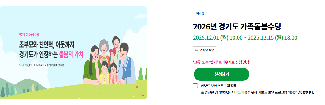 드디어 2026년 경기형 가족돌봄수당 신청 접수가 시작되었습니다. 가장 중요한 것은 접수 마감이 12월 15일(월)로 일주일밖에 남지 않았다는 점입니다.