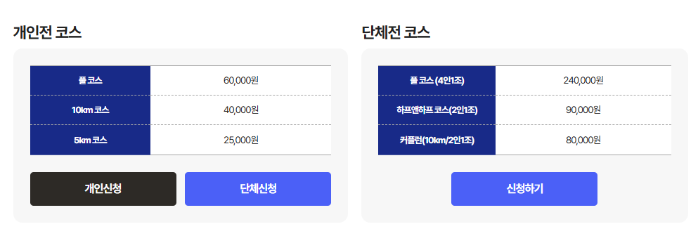 | 풀코스 | 60,000원 | 엘리트 및 마스터즈 통합 운영 |